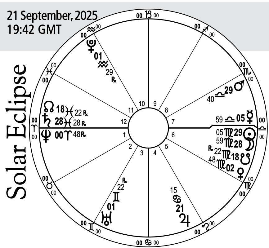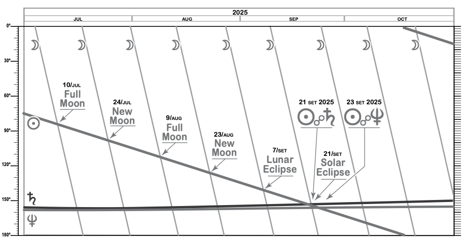 The partial solar eclipse of 21 September occurs in close opposition to Saturn and Neptune, and this may well turn out to be one of the most important and potent amplifications of the Saturn-Neptune process that plays such a dominant role in the year 2025.